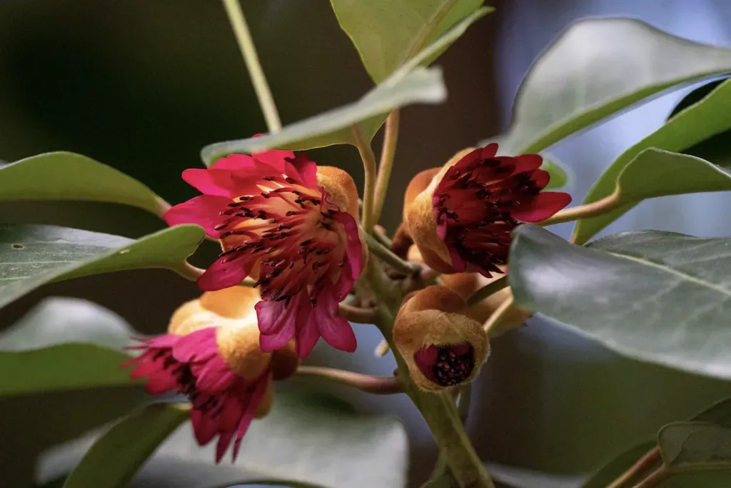 Rhodoleia championii is a rare evergreen tree known for its striking scarlet flowers and dense foliage.