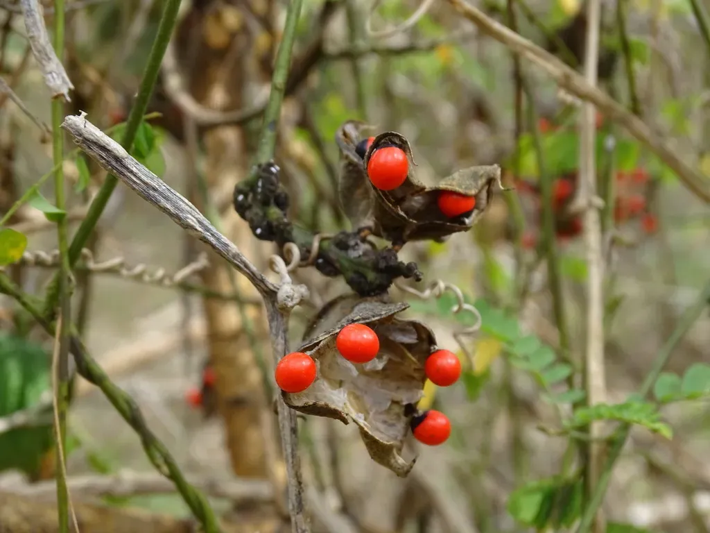 Rhynchosia precatoria is a perennial vine known commonly as Rosary Snoutbean, native to tropical and subtropical regions of the Americas.