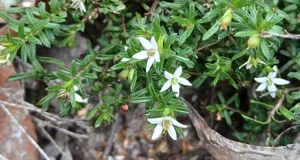 Rhytidosporum procumbens is a dwarf perennial shrub native to south-eastern Australia, characterized by small white flowers and narrow leaves.