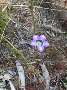 Roella ciliata is a scrambling or erect shrublet to 500 mm high, with small, stiff, hairy, needle-like leaves that end in a rigid, sharp point. The flowers are lilac-blue or white and are distinctively marked with navy blue to black spots or a band on the petal lobes.