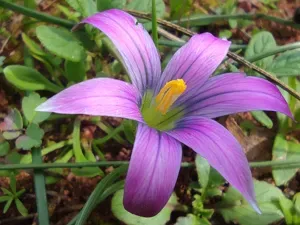Romulea ramiflora is a herbaceous, tuberous geophyte native to the Mediterranean region, characterized by small flowers that are lilac-blue to pinkish with yellow-green outer parts and a white or yellow throat.