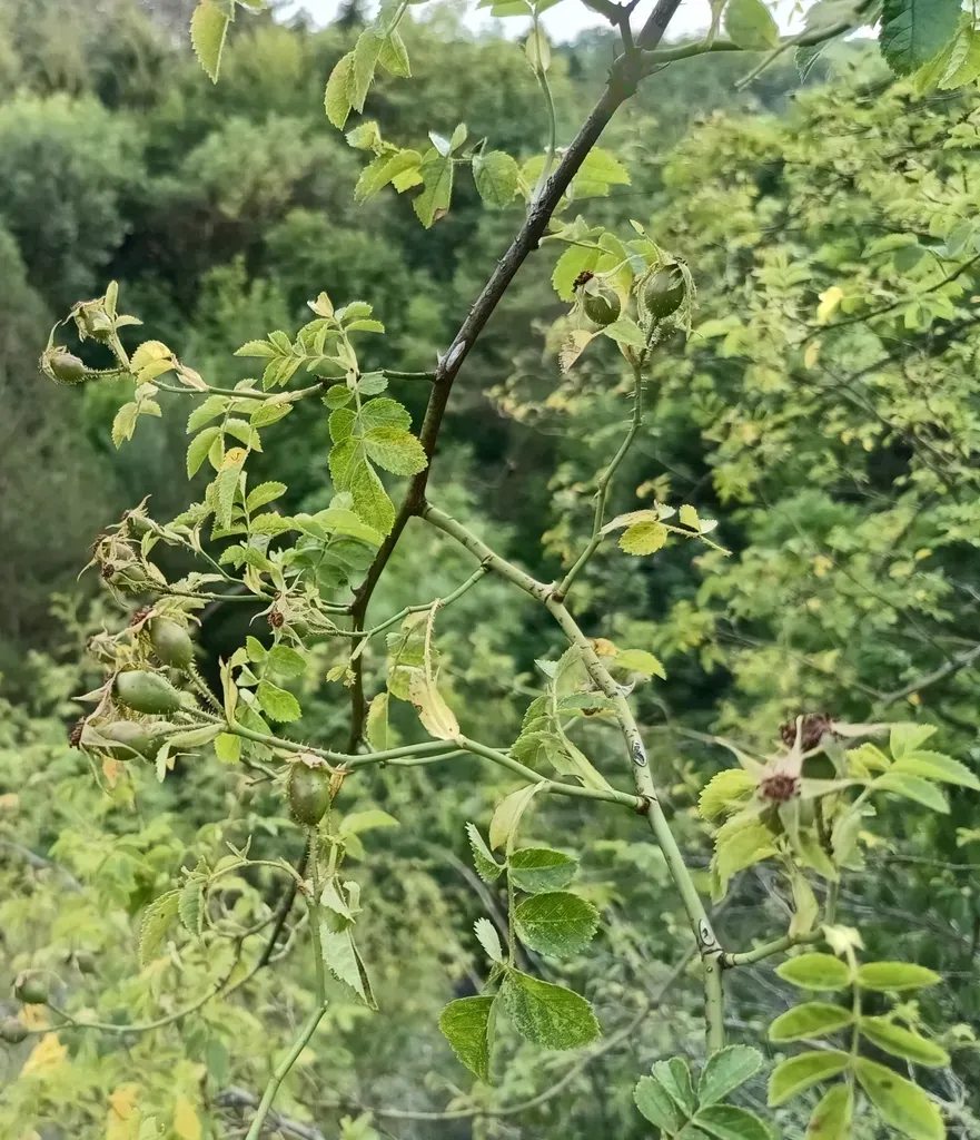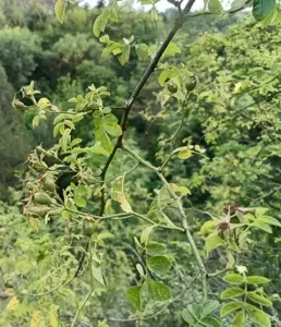 A deciduous shrub with small, pinkish flowers and edible hips.