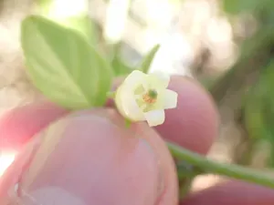 Salpichroa origanifolia is a perennial climbing vine in the nightshade family with white bell-shaped flowers and oval-shaped leaves.