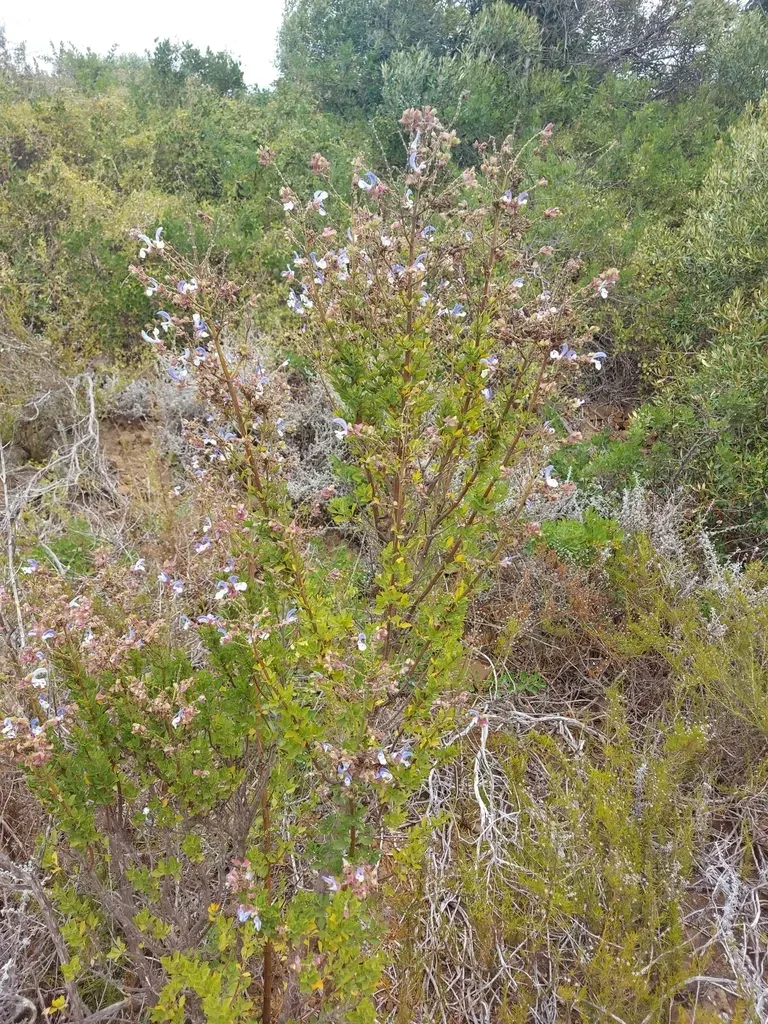 Salvia chamelaeagnea is an evergreen shrub native to South Africa, known for its dense bushy habit and attractive blue flowers.