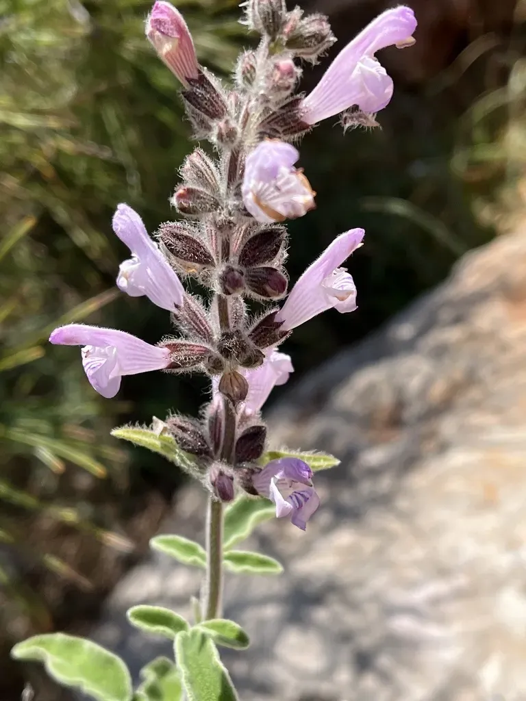 Salvia fruticosa is an evergreen shrub known for its aromatic leaves and frosty appearance.