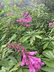 A woody-based perennial or branching shrub with velvety leaves and clusters of vibrant cerise-rose flowers.