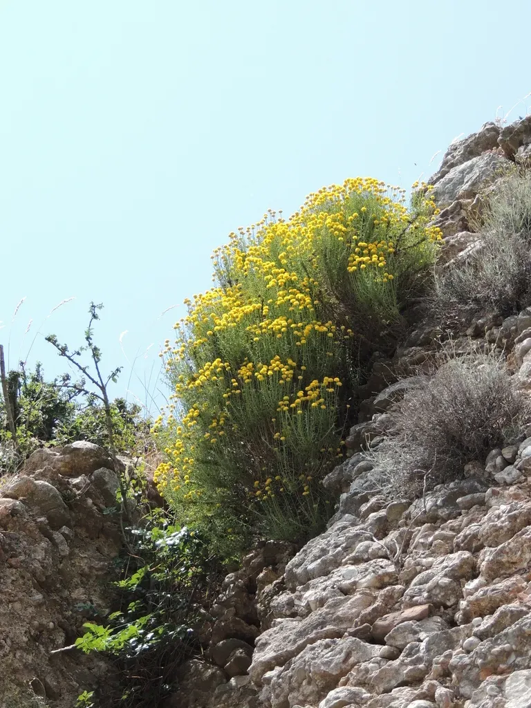 A small, evergreen, aromatic sub-shrub with silver-gray foliage and bright yellow button-like flowers.