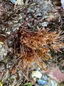 Sarcodiotheca gaudichaudii is a bright red seaweed characterized by a bushy appearance with a disc-shaped holdfast and a warty texture.