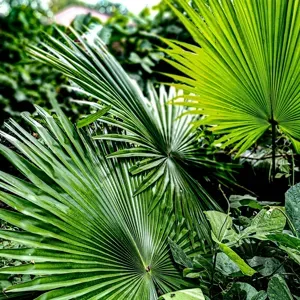 Saribus rotundifolius is an evergreen palm native to Southeast Asia, characterized by a solitary stem and large, round leaves.