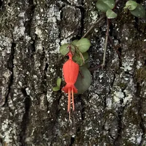 Sarmienta scandens is a prostrate evergreen perennial vine with half-woody rooting stems, bearing obovate leaves and solitary urn-shaped bright red flowers.