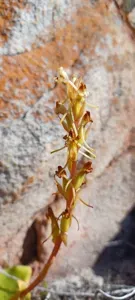 Satyrium humile is a small, slender terrestrial orchid native to the southwestern Cape Province of South Africa, growing in fynbos and stony sandy soils.