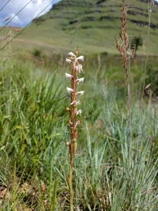A terrestrial orchid native to southern Africa, notable for its long-tailed flowers and dense inflorescence.