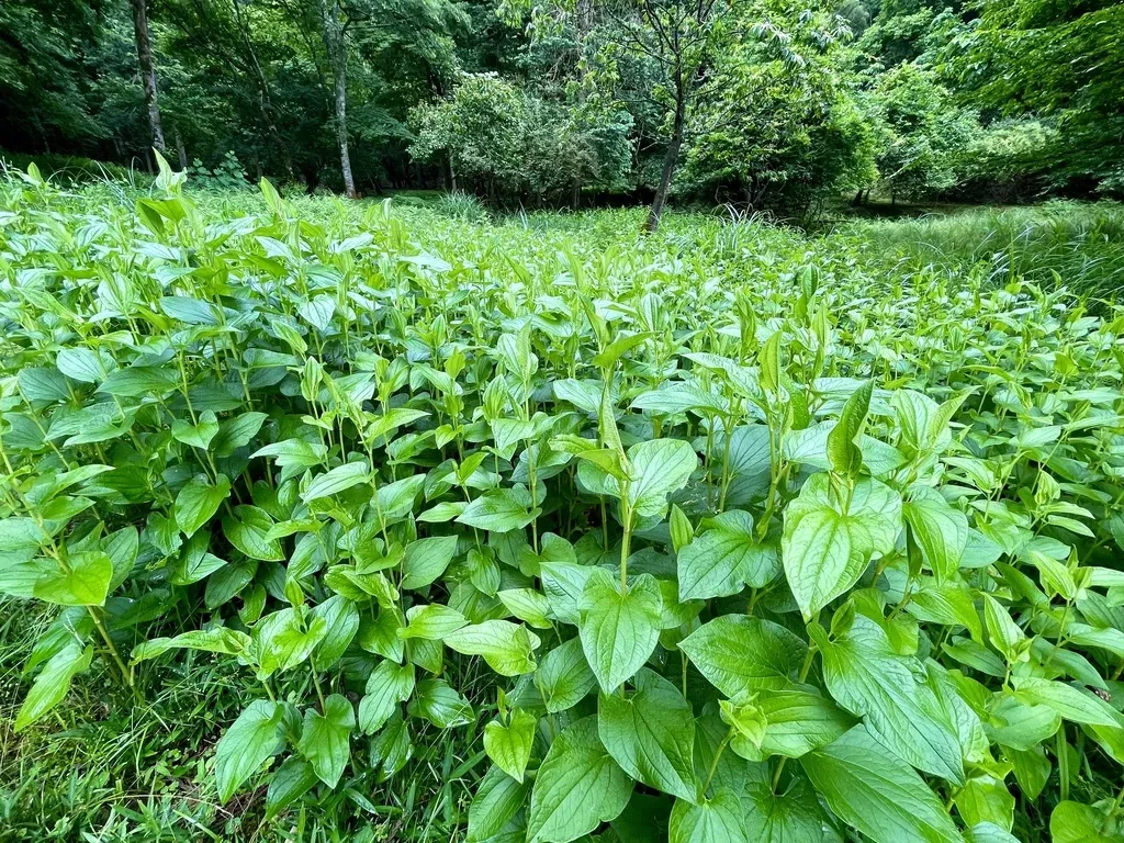 Saururus chinensis is a perennial herb native to East Asia, known for its distinctive lizard's tail-shaped flower spikes and glossy green foliage.