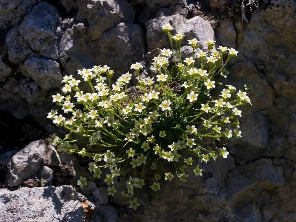 Saxifraga exarata is a mat-forming perennial plant with evergreen foliage and creamy-white flowers, native to mountainous regions in Europe.