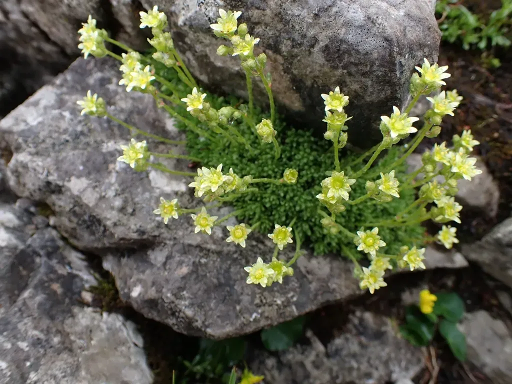 Saxifraga moschata is a small perennial plant native to mountainous regions of Europe, known for its moss-like foliage and delicate flowers.