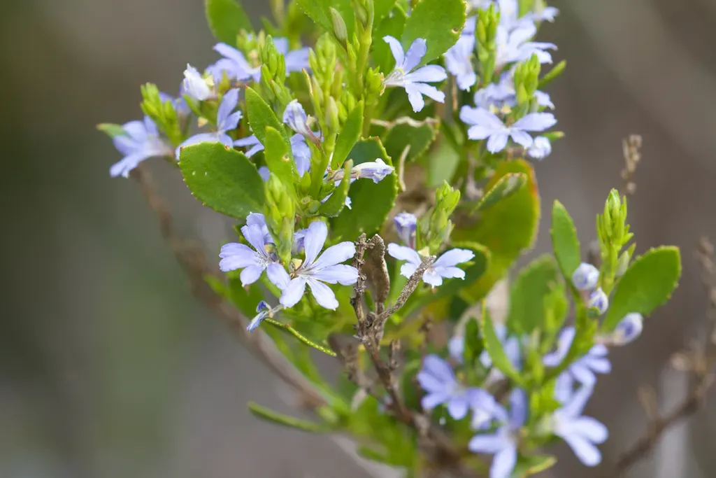 Scaevola aemula is a mat-forming, perennial herbaceous plant native to Australia, known for its fan-shaped blue flowers and sprawling growth habit.