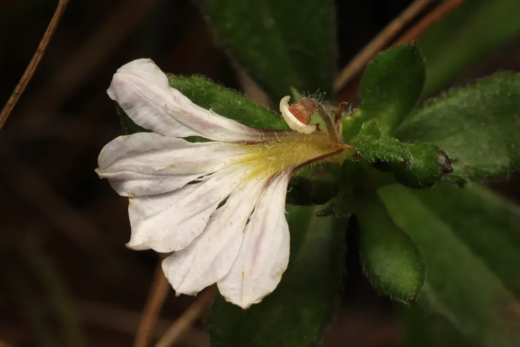 Scaevola albida is a low-growing, mat-forming herbaceous plant known for its fan-shaped pale flowers and groundcover habit.