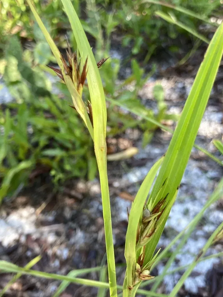 Scleria triglomerata is a perennial sedge common in eastern North America, known for its sharply triangular stems and preference for sandy or moist habitats.