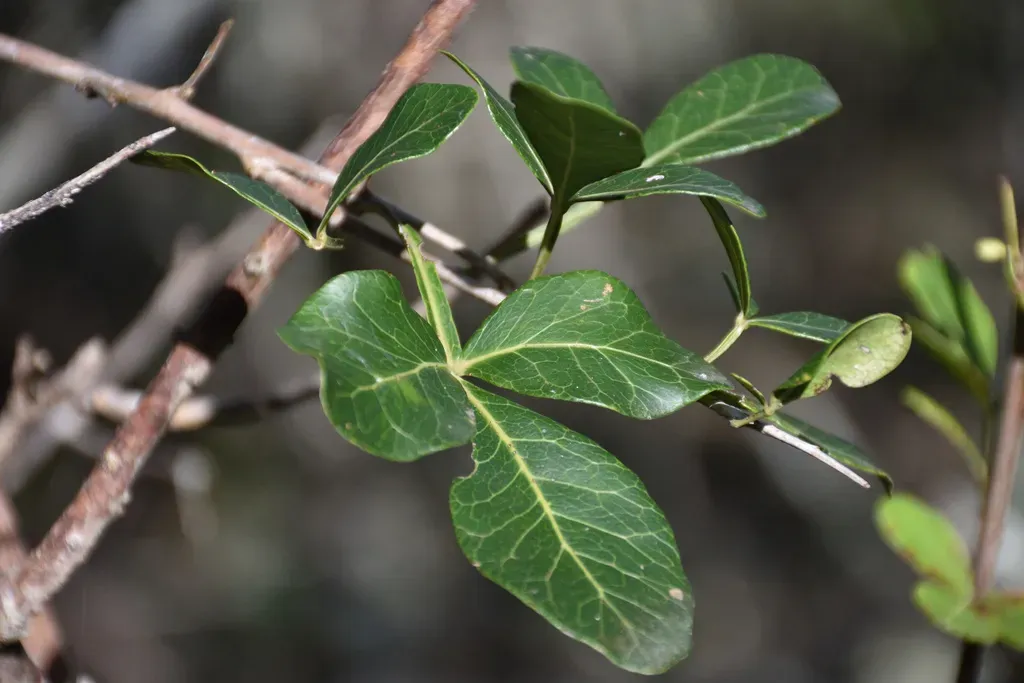 Searsia pterota is a resilient evergreen shrub or small tree known for its distinctive three-parted, wing-like foliage adapted to dry environments.