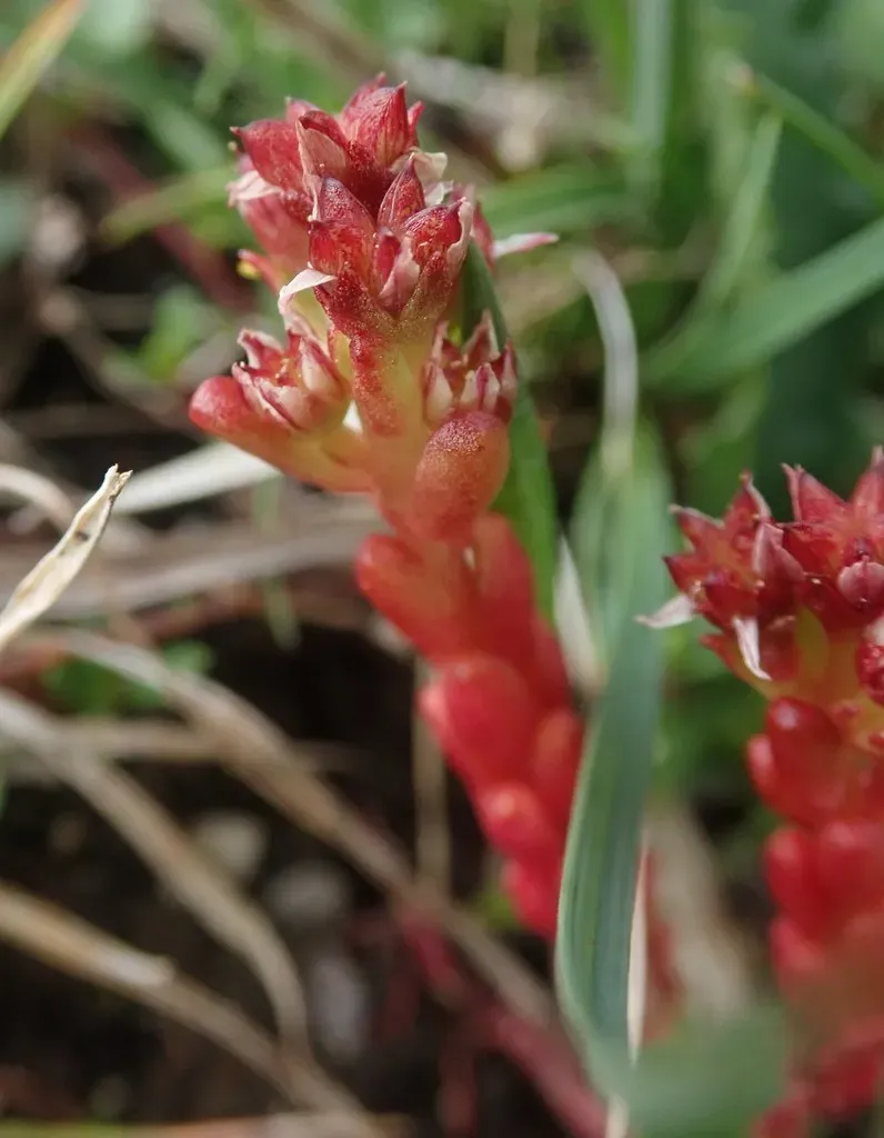 Sedum atratum is a small succulent plant native to mountainous regions of Europe, characterized by its glabrous, yellowish-green to glaucous-green leaves often flushed with dark purple, especially under dry conditions or during flowering.