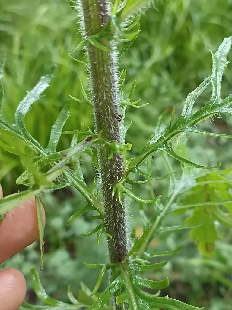 Senecio esleri is an erect herb, usually annual, rarely a short-lived perennial, growing up to approximately 2 meters tall with striate stems often tinged purple.