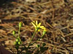 French Groundsel (Senecio Gallicus) is a perennial herb in the Asteraceae family with moderate care difficulty. It requires low watering and full sun or partial shade light in USDA hardiness zones 7-10. This plant is toxic to cats and dogs — keep it out of reach of pets.