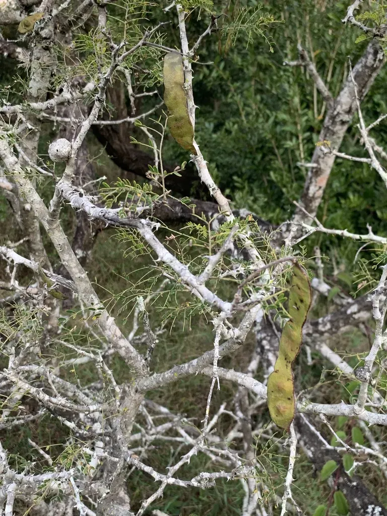 Senegalia burkei is a medium to large deciduous tree known for its strongly hooked blackish-brown thorns and creamy white to pale yellow fragrant flowers arranged in dense elongated spikes.