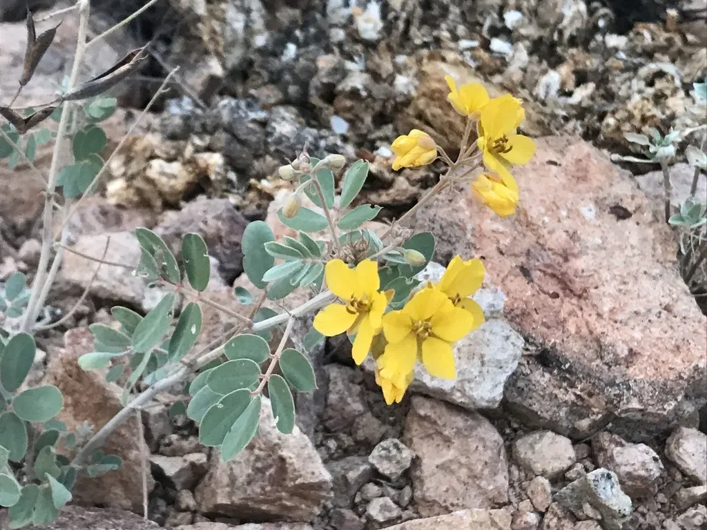 Senna covesii is a perennial subshrub native to the Mojave and Sonoran Deserts, known for its grey pubescent foliage and yellow flowers.