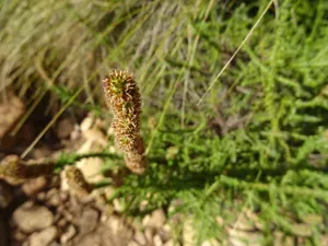 A grey-woolly, much-branched shrub native to southern Africa, with needle-like leaves and small globular flowers.