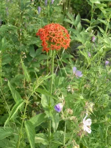 Silene chalcedonica is a perennial herbaceous plant known for its bright scarlet-orange flowers shaped like the Maltese Cross.