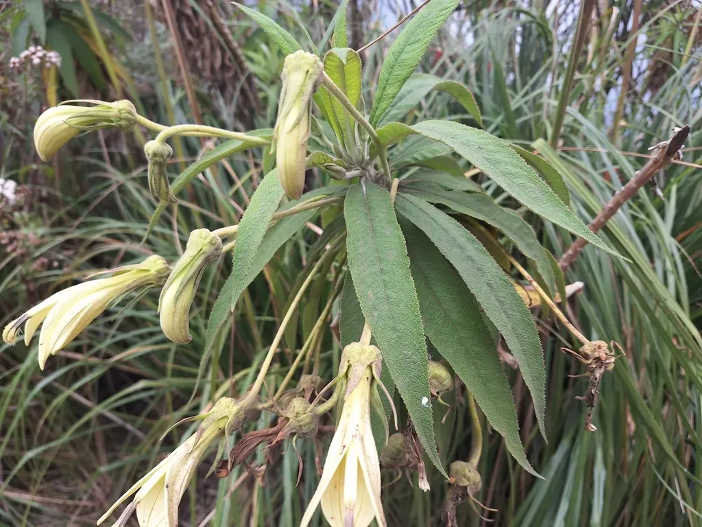 A rare, herbaceous small tree native to cloud forests in the Andes, growing up to 5 meters tall with large simple leaves and striking bell-shaped flowers.