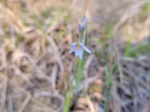 Sisyrinchium albidum is a stiff, grass-like, clump-forming perennial plant with star-shaped white to blue flowers with yellow centers.