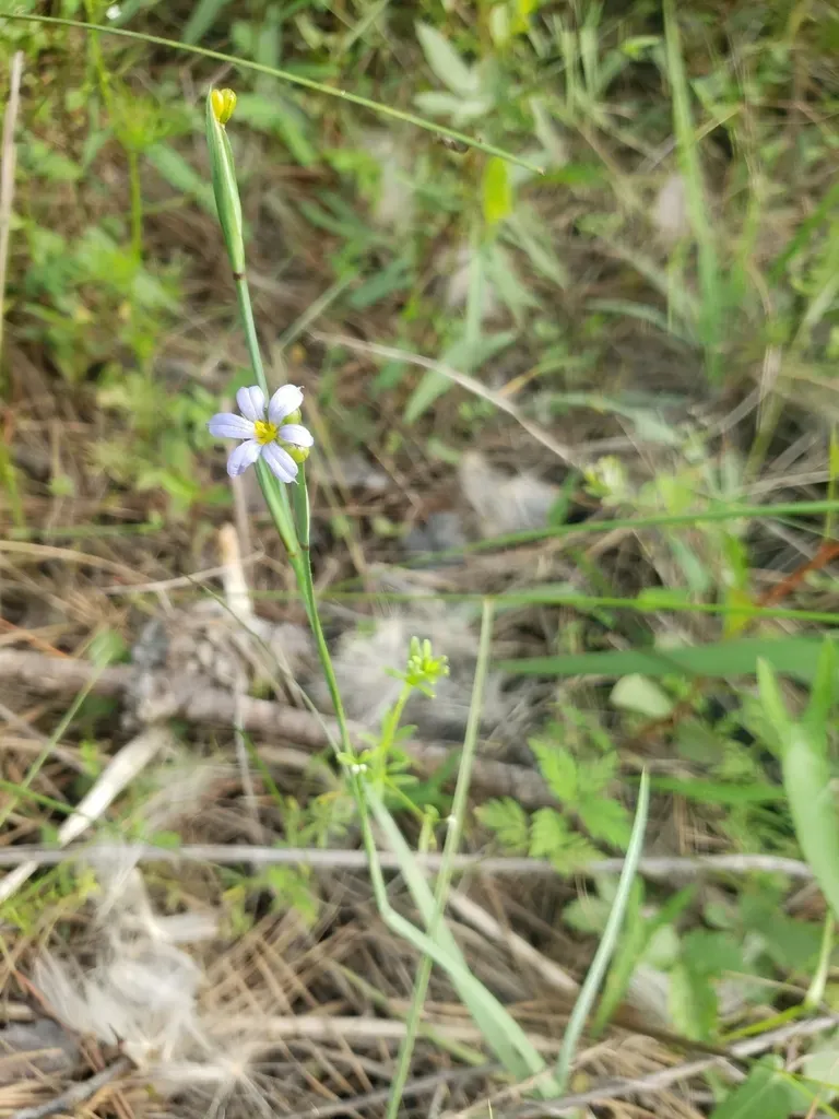 Sisyrinchium angustifolium is a perennial herbaceous plant in the iris family, commonly known for its grass-like leaves and star-shaped blue to violet flowers.