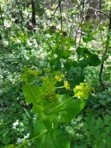 Smyrnium perfoliatum is a biennial herbaceous plant belonging to the Apiaceae family, growing up to 1.5 meters tall with distinctive perfoliate leaves and umbels of yellowish-green flowers.