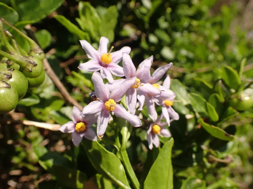 Solanum africanum is a hardy creeper or shrub native to South Africa, known for its purple, mauve, or white flowers with yellow centers and toxic berries.