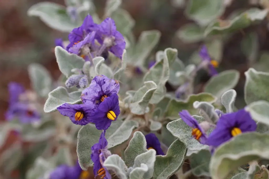 Solanum lasiophyllum is an erect or rounded shrub native to Western and Central Australia, known for its purple-violet flowers and adaptation to arid environments.
