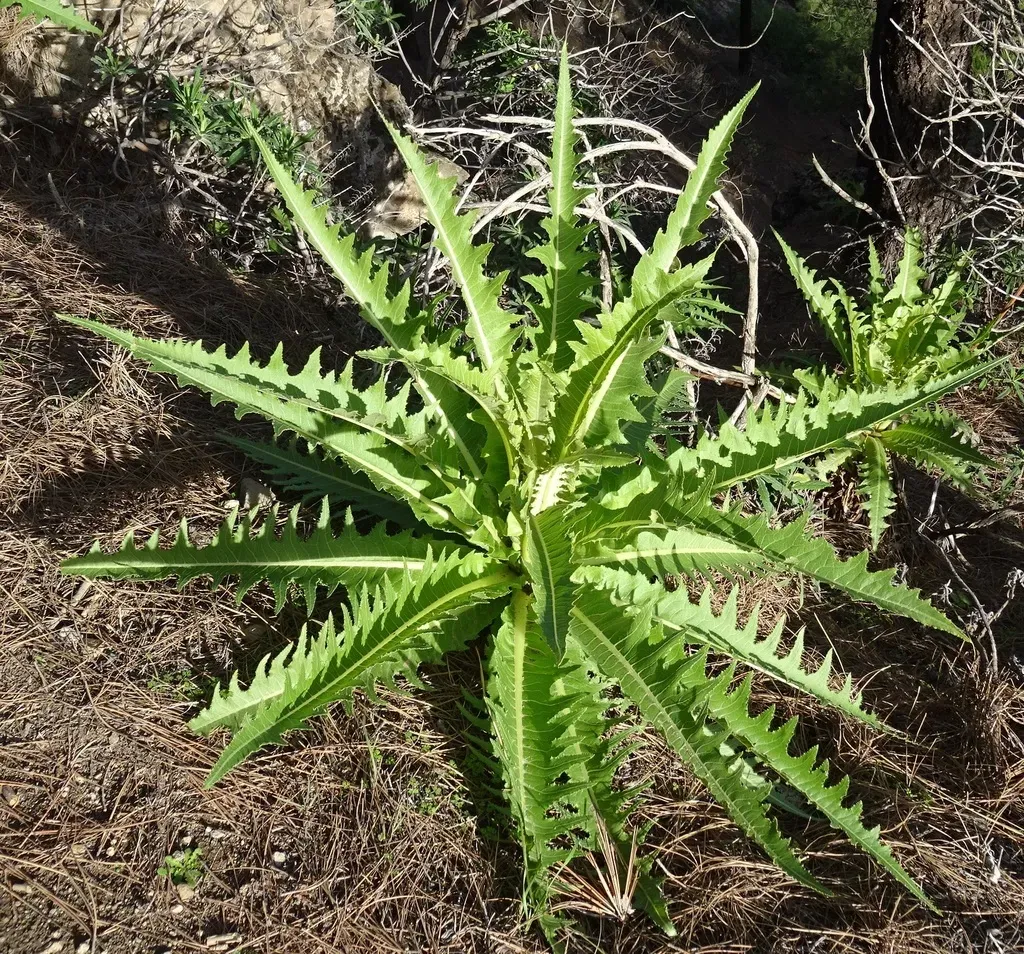 Sonchus acaulis is a perennial herbaceous plant native to the Canary Islands, notable for its large basal rosette of leaves and tall flowering stalk.