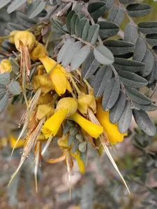 Sophora macrocarpa is a flowering shrub or small tree native to Chile, known for its bright yellow, pendulous flowers and fine foliage.