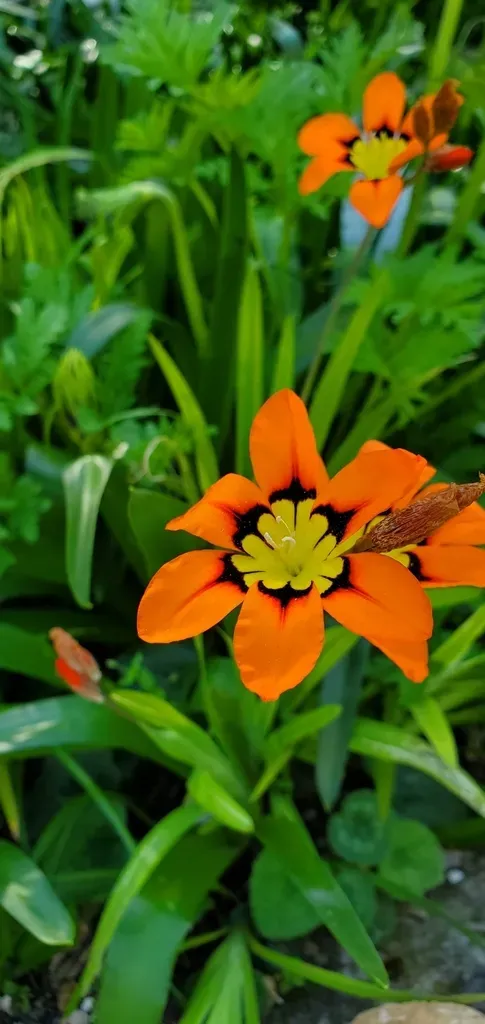 Sparaxis tricolor is a cormous perennial known for its brightly colored, star-shaped flowers that bloom in spring and early summer.