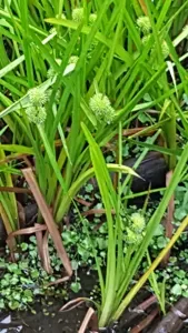 Sparganium eurycarpum is a robust aquatic perennial plant native to wetlands in Eurasia and North America, known for its distinctive round clusters of fruits resembling a mace.