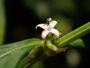A perennial herb or subshrub in the Rubiaceae family, native to the Americas, known for its broad leaves and small white flowers.