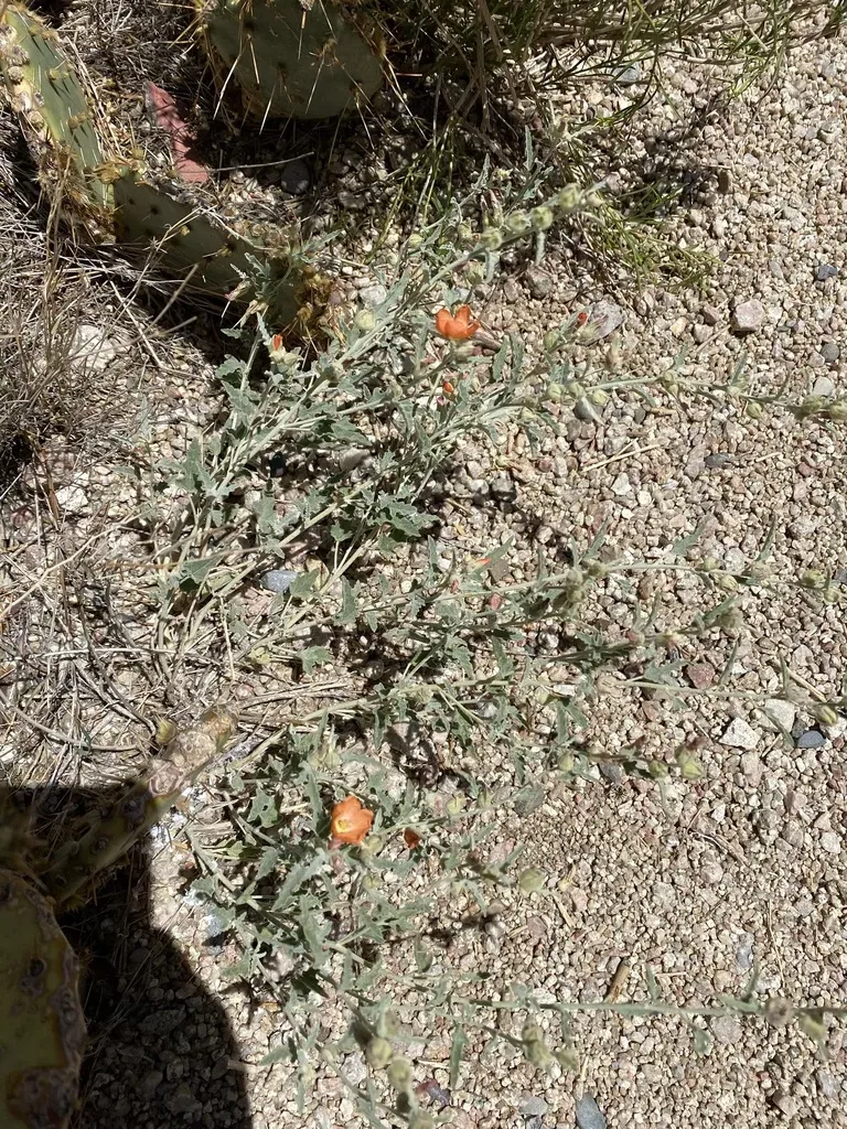 Sphaeralcea hastulata is a low growing herb or subshrub native to arid regions, known for its simple, alternate leaves and orange flowers.