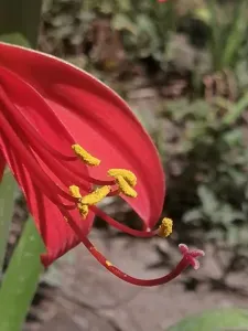 A tender, bulbous perennial known for its striking, large red flowers resembling a velvet orchid.