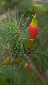 Stenanthera pinifolia is a small shrub native to south-eastern Australia, characterized by narrow, linear leaves and tubular flowers that range in color from yellow to red.