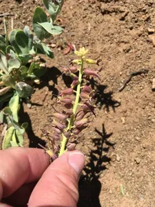 Streptanthus cordatus is a perennial herb in the mustard family known for its waxy texture and heart-shaped basal leaves.