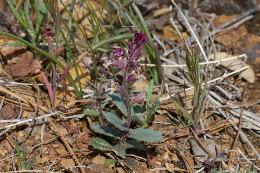 Streptanthus hispidus is a bristly annual herb native and endemic to California, growing up to 30 centimeters tall with raceme flowers.