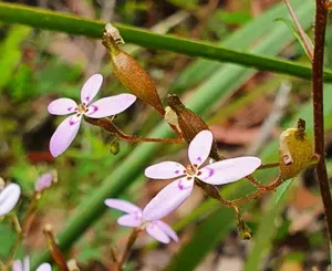 Stylidium laricifolium is a perennial subshrub native to eastern Australia, characterized by its linear, pine-like leaves and pale pink to white flowers arranged in panicles.