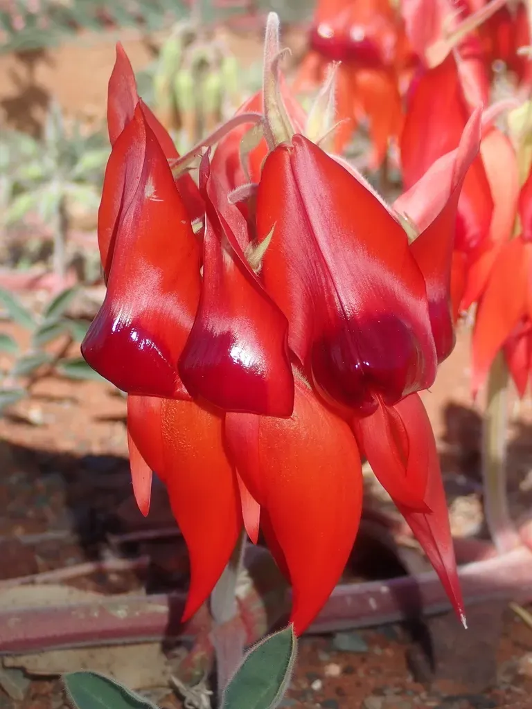 Swainsona formosa, commonly known as Sturt's Desert Pea, is a striking prostrate herbaceous plant native to the arid regions of Australia, easily recognized by its vivid red flowers with a prominent black or dark red boss.