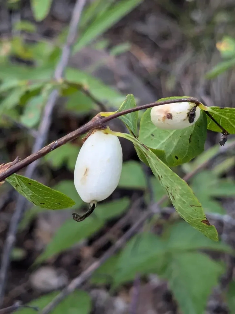 Symphoricarpos rotundifolius is a North American subshrub in the Honeysuckle family, known for its white to pink berries and round leaves.