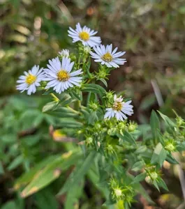 Symphyotrichum firmum is a perennial herbaceous plant known for its shiny, smooth leaves and clusters of small white to pale lavender flowers, typically found in wetland habitats.
